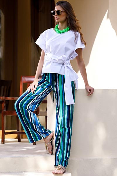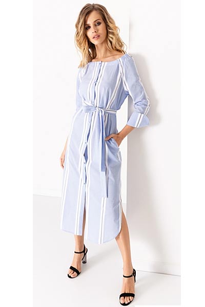 Сочетание белого с голубым очень летнее, напоминающее о море. В этом сезоне брестские дизайнеры в изобилии предложили платья в бело-голубой гамме. Это сочетание очень хорошо подходит русоволосым и блондинкам, подчеркнёт природные краски.
