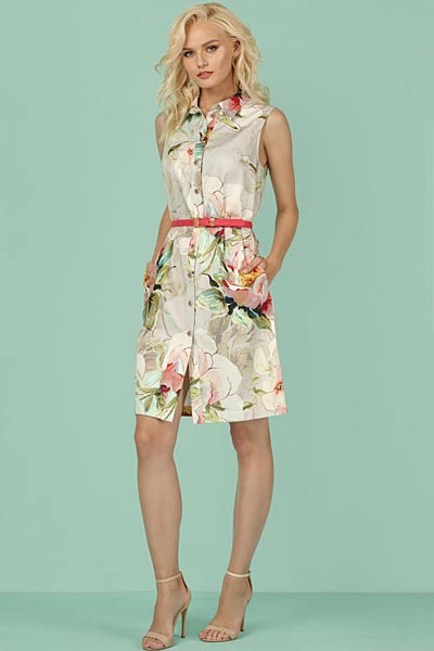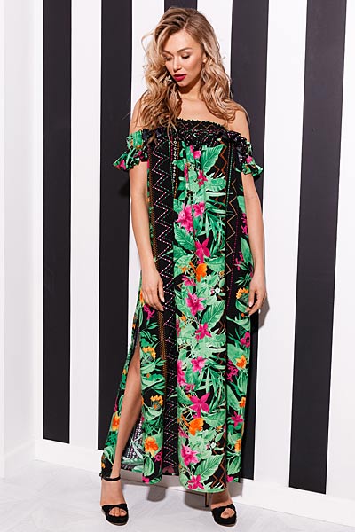 Мяту и коралл в этом сезоне подружили многие дизайнеры. Неординарное сочетание, напоминающее то ли цветочную клумбу, то ли кондитерские изделия. Фирма Ника предложила такое сочетание в традиционном варианте - цветочный рисунок, актуальный в этом сезоне.